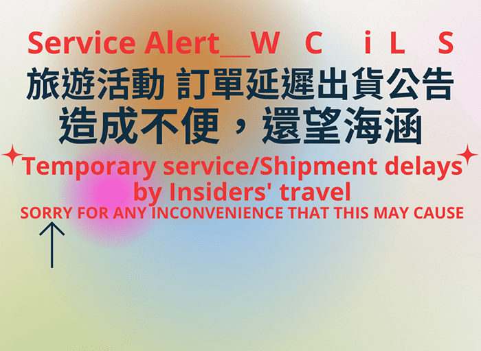 因近期「 WCiLS 官方網站 」內部人員參與旅遊活動,相關服務異動說明及訂單出貨時間將有延遲,以下期間為旅遊活動日,無法立即提供服務 -